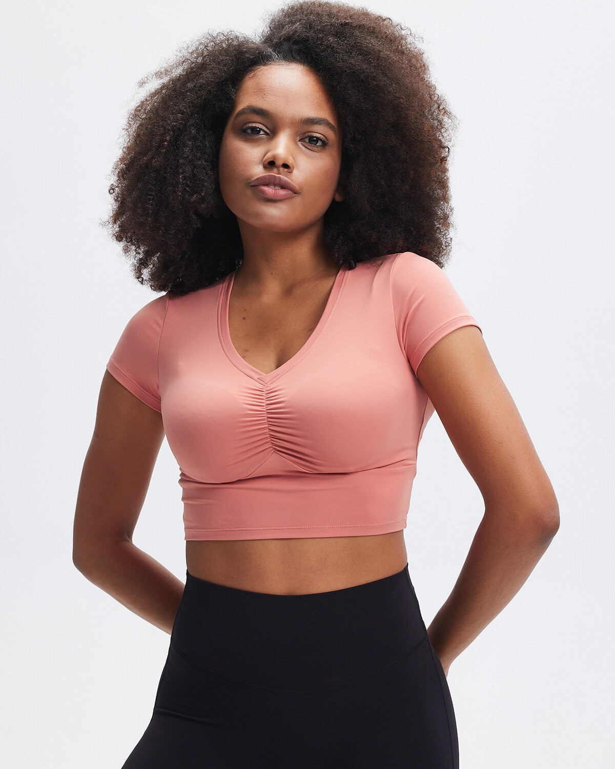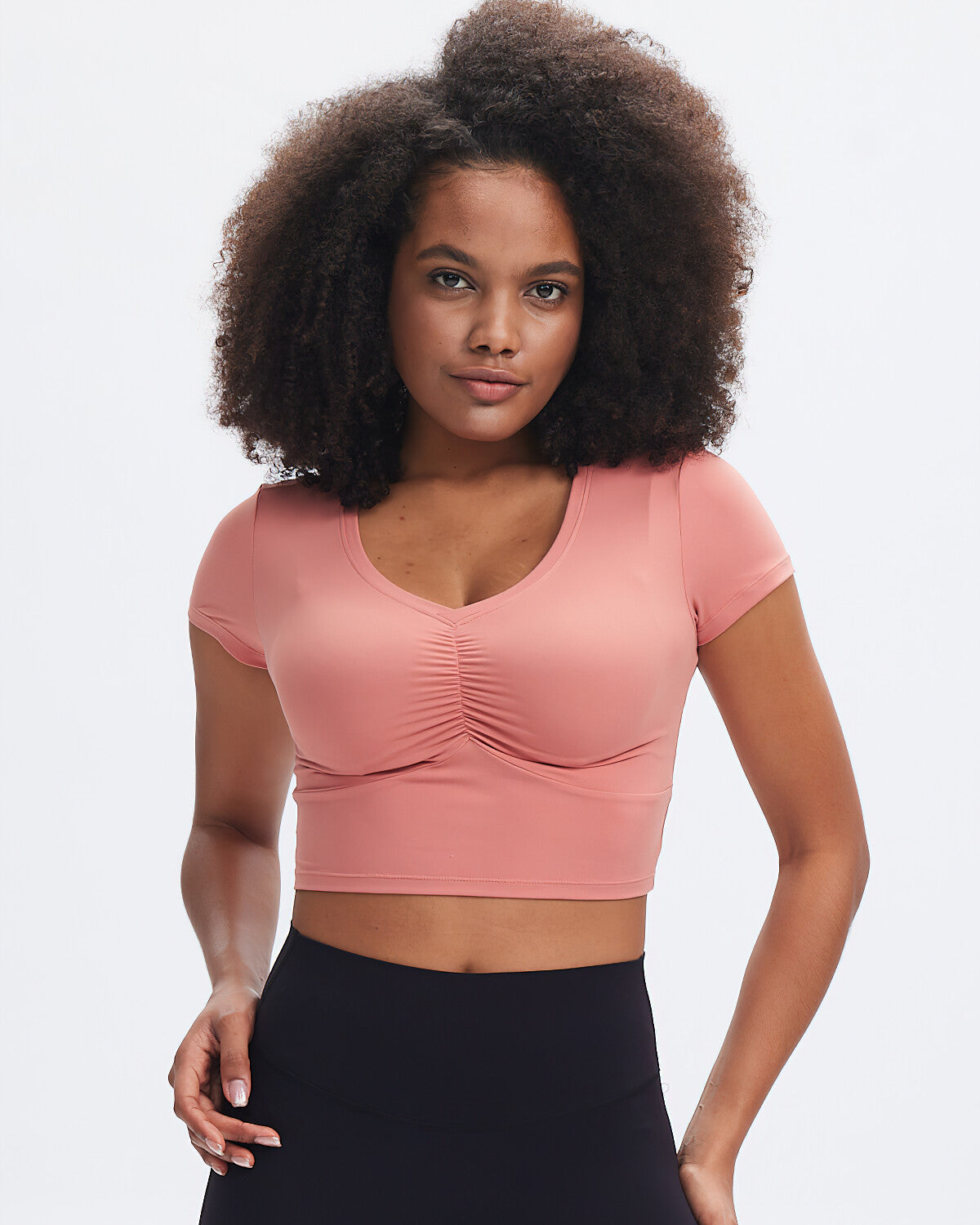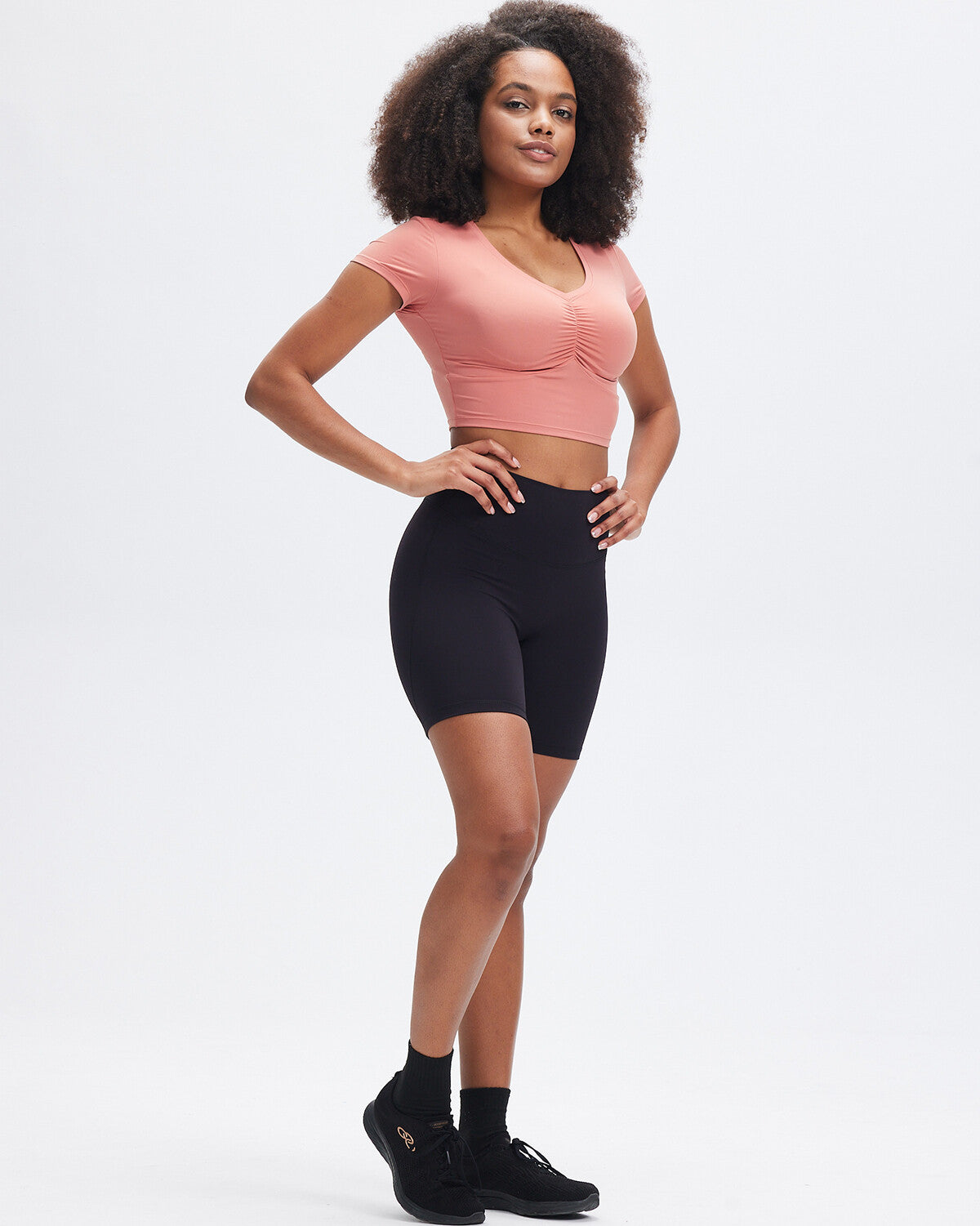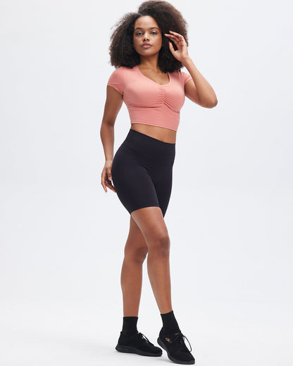 Infuse your wardrobe with the Janelle Crop Top – a seamless blend of style and function. Its v-neck and cropped design offer a chic twist, while the scrunch detailing and short sleeves add elegance. Whether at the gym or a night out, the fitted silhouette ensures a flattering look.