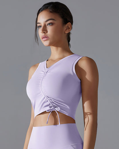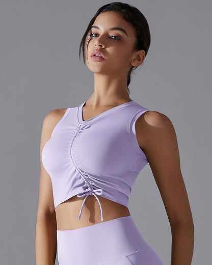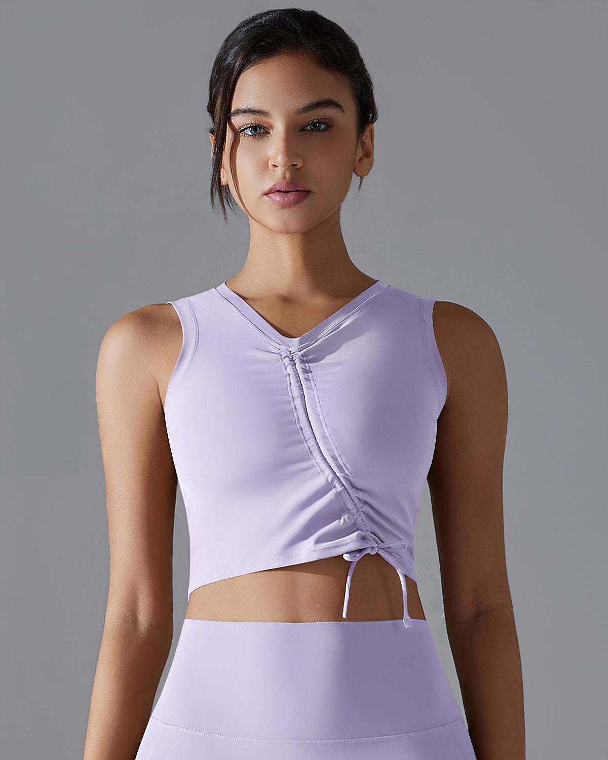 The standout feature is the curved side drawstring design, running from the tip of the V-neckline to the hem, adding a stylish, dynamic touch to your workout gear. Made with breathable, moisture-wicking fabric, this top keeps you cool and dry, no matter how intense your session gets.