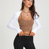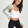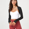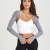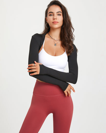 Introducing the Angelica Long Sleeve, a versatile and stylish garment designed to provide full shoulder coverage without bulkiness. This shoulder shrug and crop top features thumbholes for a secure fit, perfect for chilly weather. The breathable fabric provides a cooling effect, ideal for warm weather or transitional seasons. Layer it over your favorite bralette for a dramatic look.