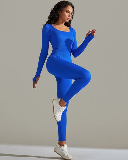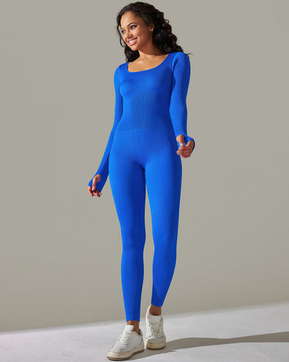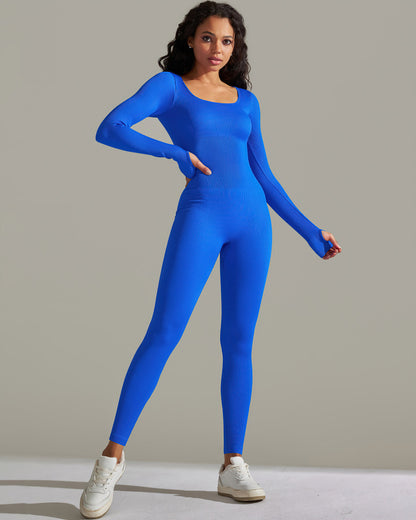 Power up your performance with the Gia Seamless Jumpsuit, a sleek one-piece designed to move with you. Featuring a square collar and long sleeves with thumb holes, this jumpsuit delivers a modern, athletic look while keeping you warm and supported during any workout.