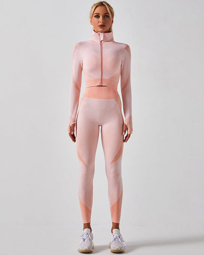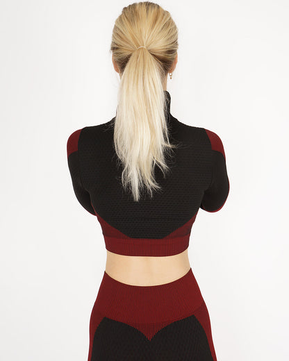 The long sleeve zip-up top has a raglan sleeve detailed with figure-contouring shading. Fitted design with midriff crop and high tie zipper is made from a seamless fabric that is soft to the touch and gentle to your skin. Body-hugging fit shows your beautiful curve.