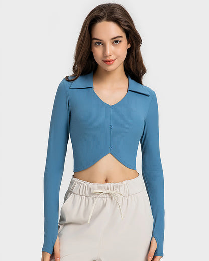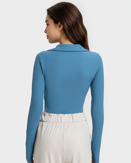 Elevate your workout wardrobe with the Megan Long Sleeve – a beacon of style and functionality designed to propel your fitness journey forward. This cropped fitness long sleeve boasts a v-neck, lapel collar, and a ribbed texture, creating a fusion of fashion-forward design and dynamic comfort.