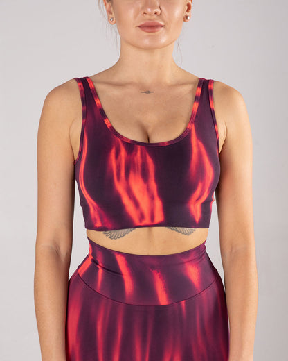 Turn up the heat with the Daphne Sports Bra, featuring a striking tie-dye pattern that mimics swirling smoke and flames. With a seamless design and a sleek U-shaped neckline and back, this sports bra is as stylish as it is functional.