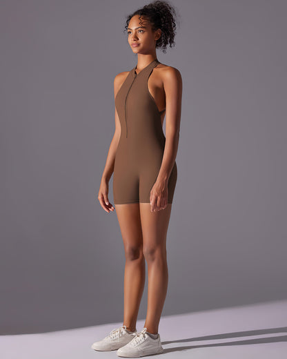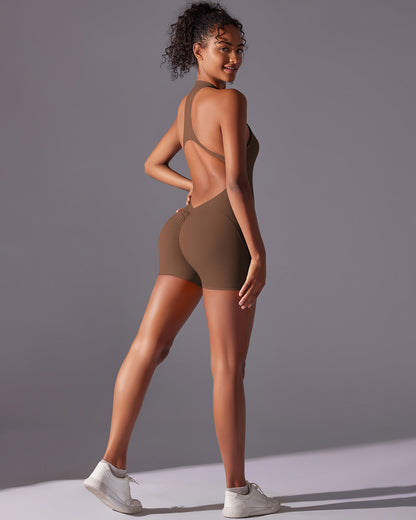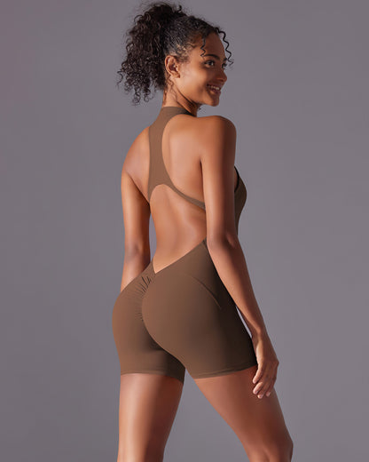 Elevate your game with the Elodie Seamless Scrunch Jumpsuit - where performance meets stunning design. This short, seamless jumpsuit features a chic 3/4 front zipper and a diamond open back, giving you an eye-catching look with a flattering fit.