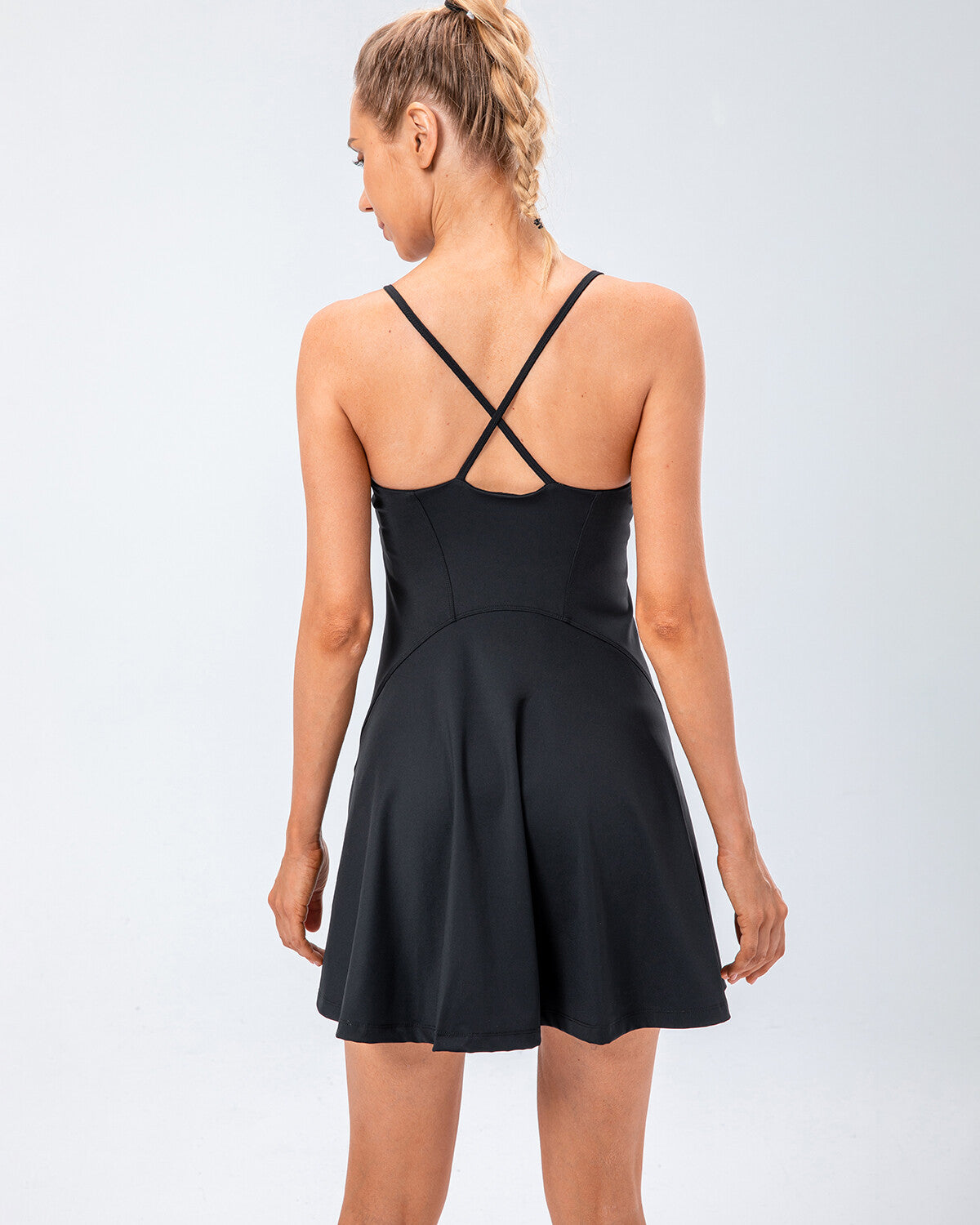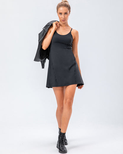 Introducing the Margaret Athletic Dress - the evening gown of workout dresses. This one-piece dress features cross-back thin shoulder straps, sleek seams, and lightweight stretch fabric that create a gorgeous silhouette. With built-in shorts and pockets, it's perfect for sports like tennis or running.