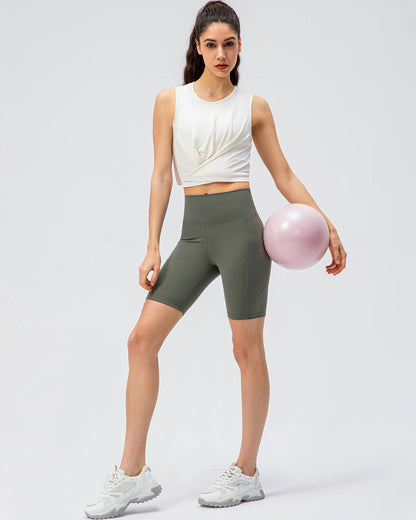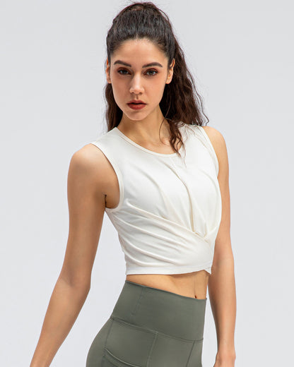 The Ryleigh Crop Top is a fashionable and functional workout top perfect for any physical activity. It features an ultra-feminine front wrap detail, and sleeveless cut, allowing for maximum freedom of movement. The sports fabric is a custom mix of nylon and spandex, providing comfort, flexibility, and moisture-wicking properties to keep you cool and dry.