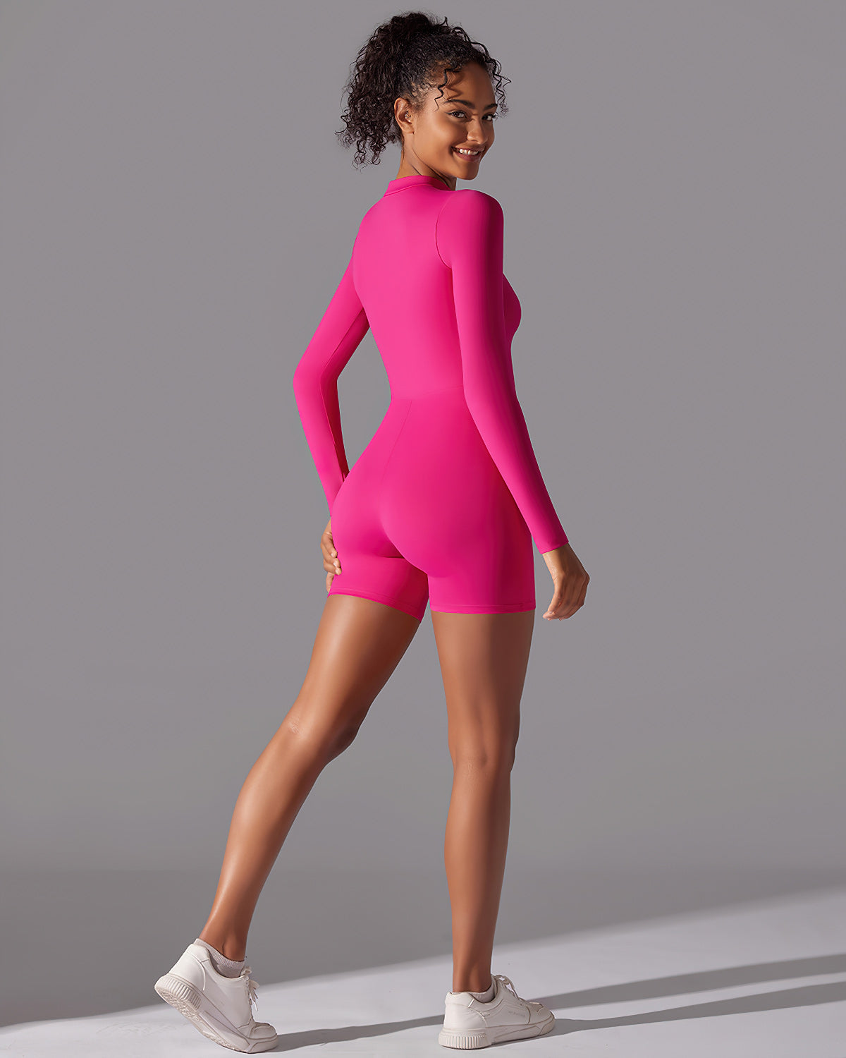 Unleash your power in the Scarlett Seamless Jumpsuit, a sleek one-piece designed for high performance and ultimate comfort. This short, long-sleeve jumpsuit features a 3/4 front zipper and a stand collar, giving you a modern, athletic look that's perfect for crushing any workout.