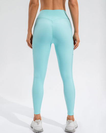 Featuring a V-waistband and convenient pockets on both sides, these full-length leggings are designed to provide maximum comfort and convenience during your workouts. The scrunch bum detailing adds a touch of style while also accentuating your curves. Plus, the lightweight fabric ensures that you'll have a full range of motion for any exercise you choose to do.