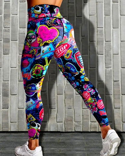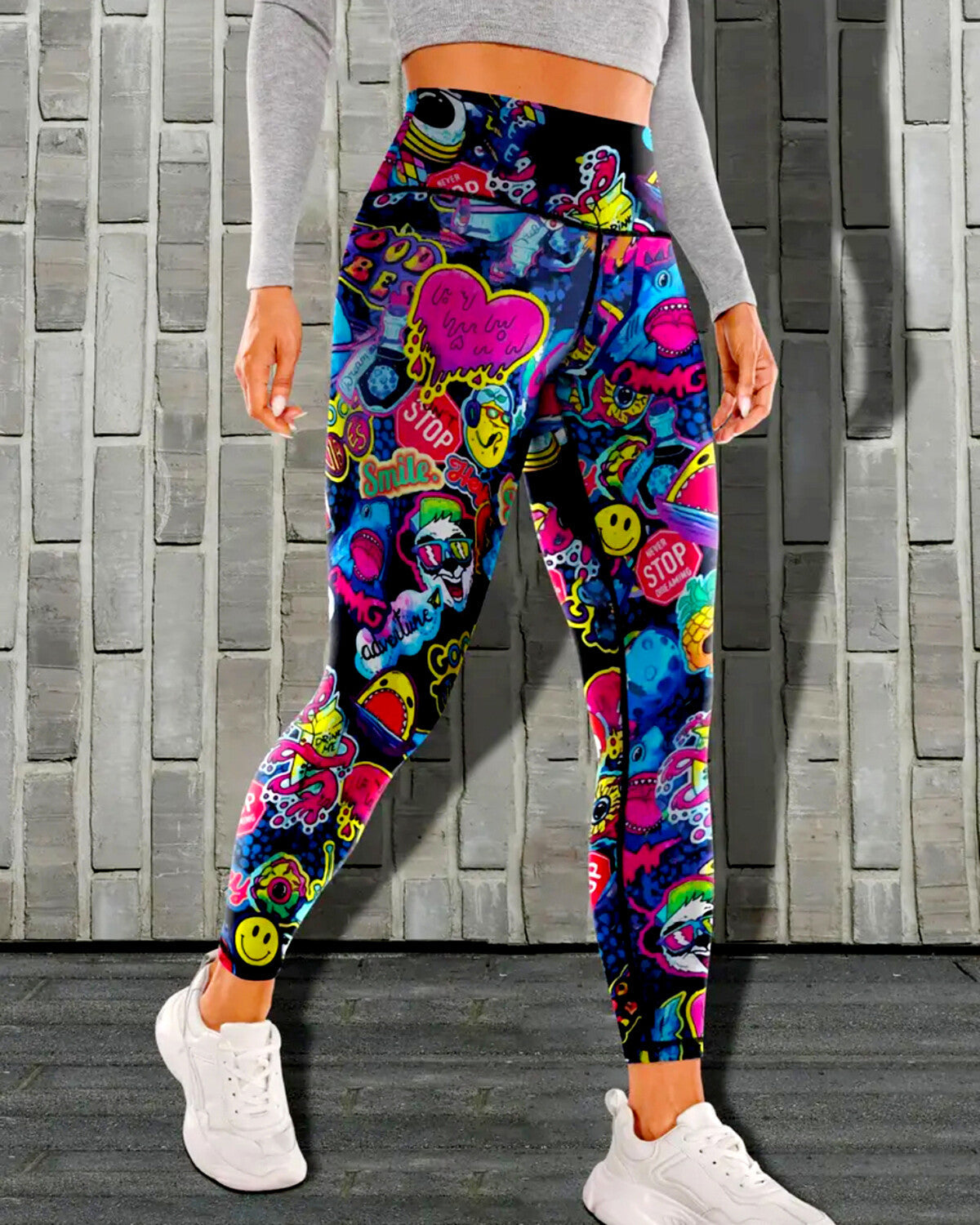 Get ready to make a statement. These high-waisted leggings are a bold fusion of art and athleisure. The vibrant mix of characters, stickers, and text creates a dynamic design that's as unique as you are.
